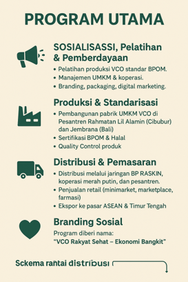 Indonesia adalah negara dengan potensi kelapa terbesar di dunia. Namun, sebagian besar hasil kelapa hanya dijual dalam bentuk mentah tanpa nilai tambah Virgin Coconut Oil (VCO) adalah produk bernilai tinggi yang sudah diakui dunia internasional sebagai superfood dengan manfaat kesehatan luar biasa. Program sosialisasi, pelatihan, pendampingan, produksi & Distribusi salahsatunya VCO berbasis UMKM, Koperasi Rakyat (Merah Putih) & Komunitas dapat menjadi instrumen strategis dalam pengentasan kemiskinan, pemberdayaan ekonomi lokal, sekaligus peningkatan kesehatan masyarakat. Melalui usulan kerjasama ini, diharapkan terbentuk ekosistem produk turunan kelapa khususnya VCO secara nasional yang terintegrasi, berbasis komunitas, koperasi, dan UMKM, dengan dukungan resmi dari BP.TASKIN.